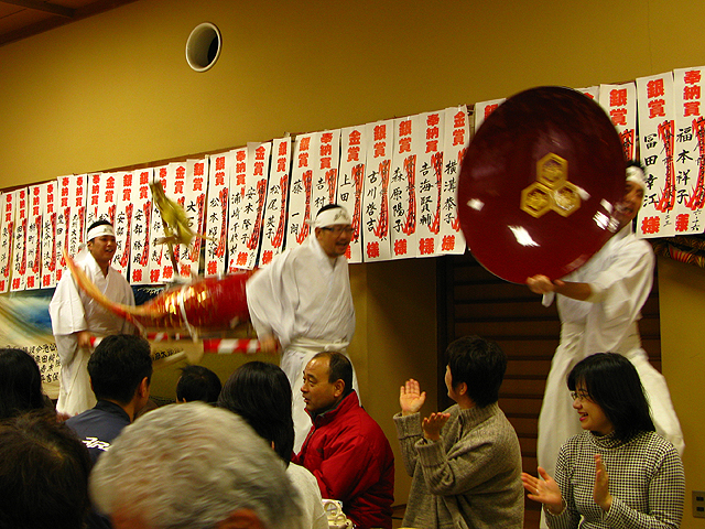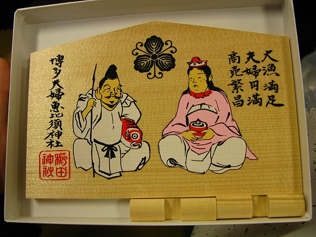 そのあといよいよくじ引き。入口で番号が付いた木札を渡されて、神主さんがくじの棒を引いてその数字に該当する人に商品が当たるというモノ。金賞、銀賞、奉納賞が先に引かれたけど発表は後回し。続いて第四等の発表となって、いきなり僕の番号が呼ばれたわけです。9番なのであんまり良くない数字かなぁと思っていたら大当たり!「夫婦恵比須の立絵馬」を頂きました。